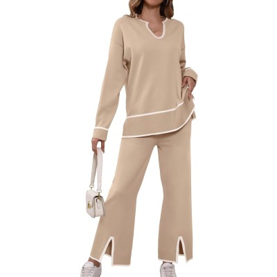 Women Sweater Sets 2 Piece Outfits Notch Neck Long Sleeve Knit Pullover Tops Wide Leg Lounge Set