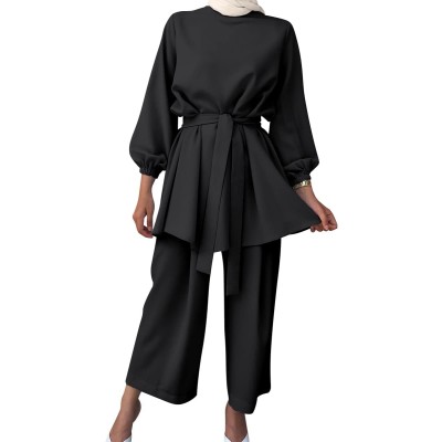 Middle East Arabic Outfits for Womens Long Sleeve Top Wide Leg Pants Set Dubai Islamic Muslim Clothes